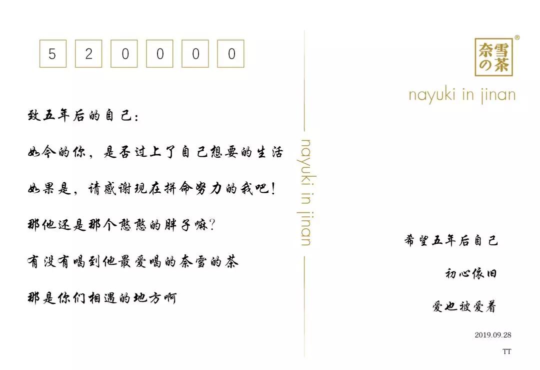许是心中的期许送给未来的自己亦或是对TA的情感流露,奈雪都会帮你免费邮寄出去,愿你心想事成,幸运常伴。