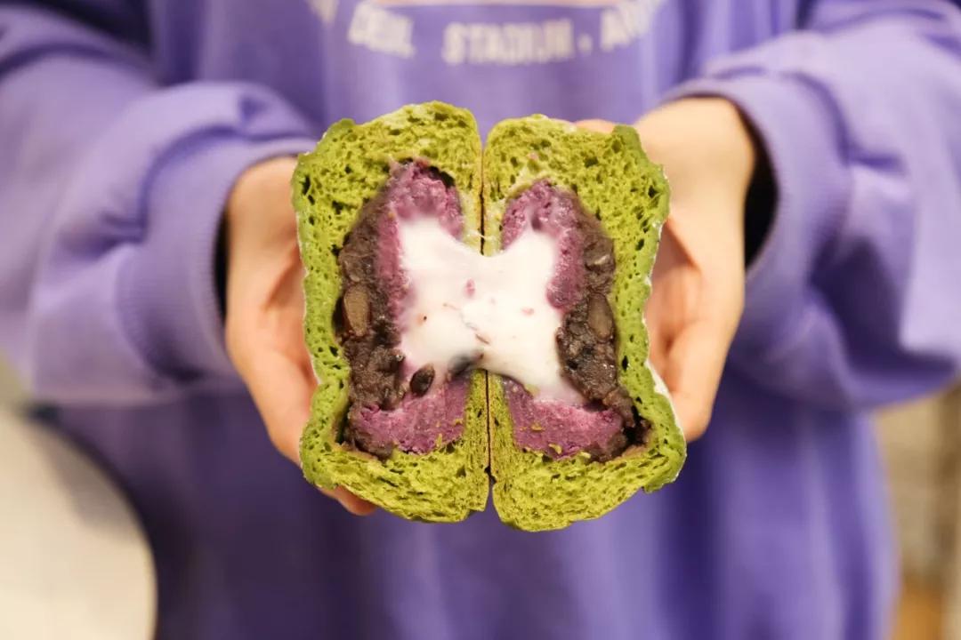 如此清翠的绿色,是用北川抹茶粉打发而成的,内里丝滑的紫薯泥与麻薯口感交织的刚刚好,甜蜜入心,清爽不甜腻。丰厚的馅料,带给味蕾多重惊喜。
